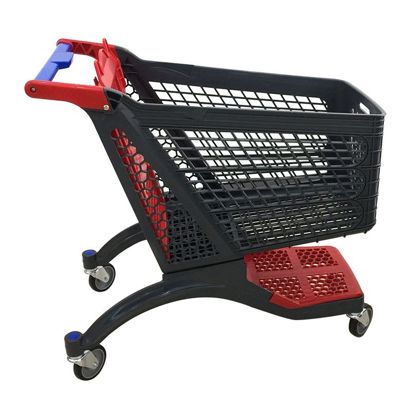 This all-plastic trolley is suitable for supermarkets, shopping malls, convenience stores, etc. The appearance is beautiful and generous, and the colors are bright and moving. Our regular colors are red and dark gray, blue, red and dark gray. Customers can customize the color according to their own preferences. Plastic armrests are more comfortable during pushing. The plastic anti-collision design plays a protective role. The bracket is precise and firm, has a longer service life, and a stronger load capacity. Adopt high-quality universal wheels, which are silent and wear-resistant during the pushing process. The logo can be customized on the handle.